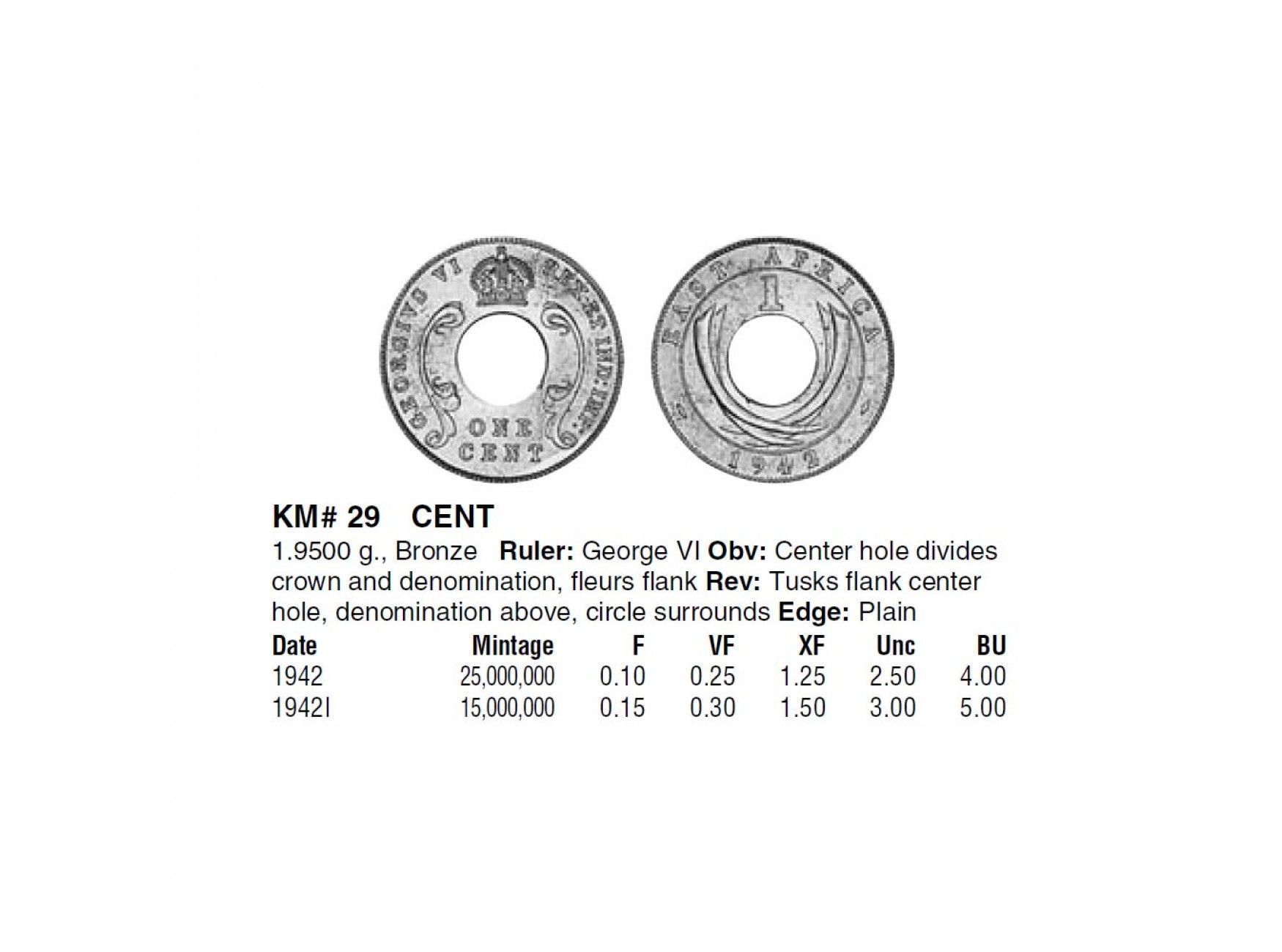 Британская Восточная Африка 1 цент 1942 г. I
