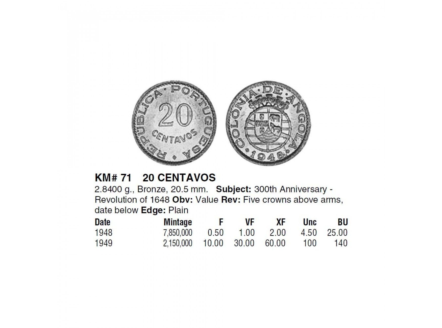 Ангола 20 сентаво 1949 г. (300 лет войне за Независимость)