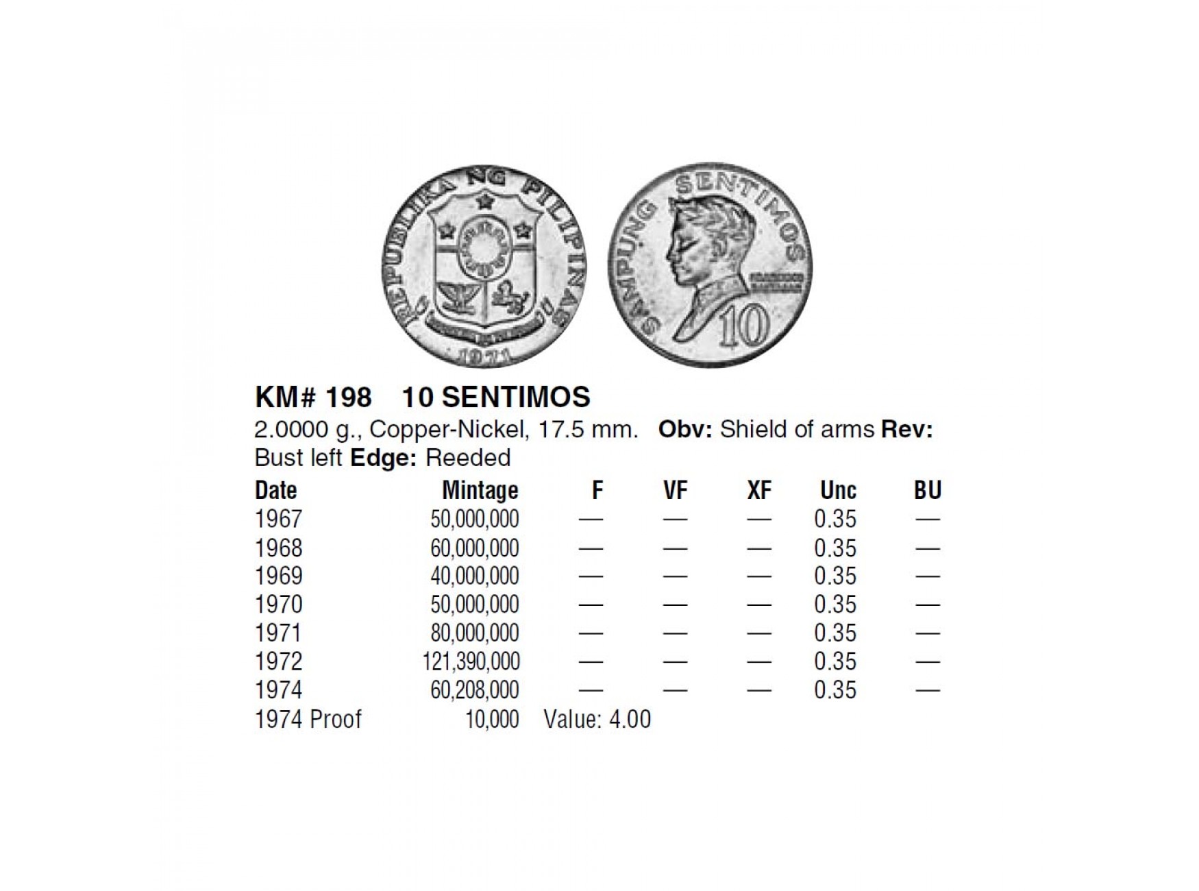 Филиппины 10 сентимо 1969 г.