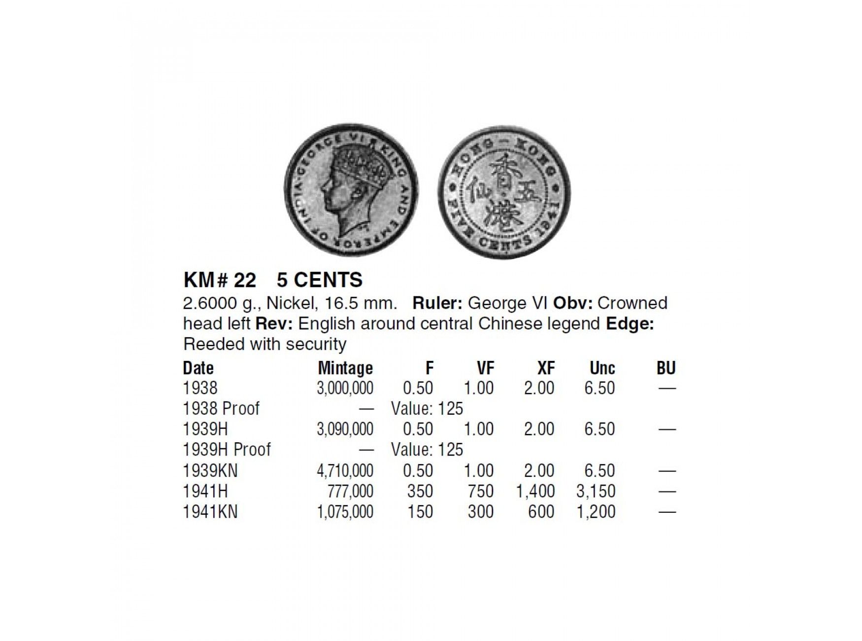Гонконг 5 центов 1938 г.