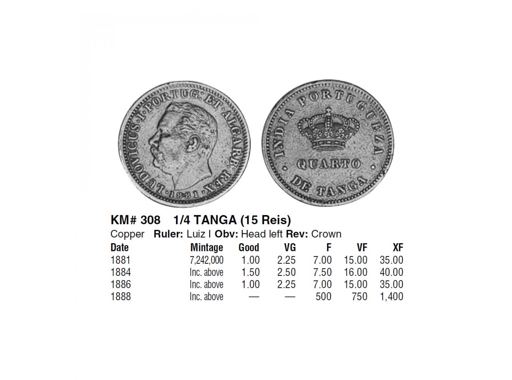 Португальская Индия 1/4 танга 1881 г.