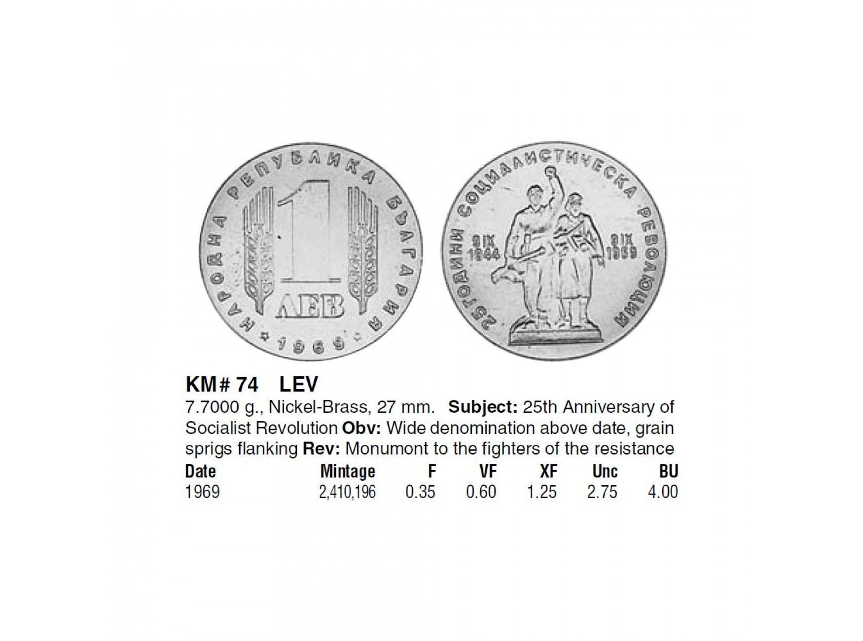 Болгария 1 лев 1969 г. (25 лет Социалистической революции)