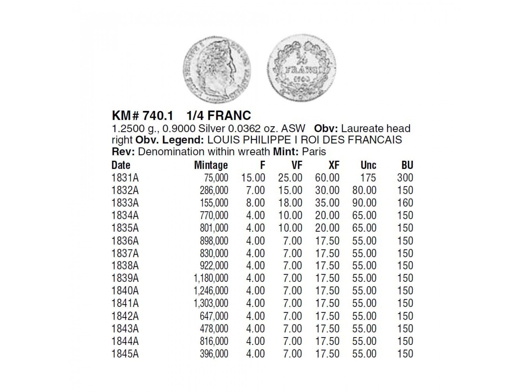 Франция 1/4 франка 1833 г. А